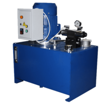 Гидростанции для гидроцилиндров обеспечивают работу механизмов, приводимых в действие силовыми гидроцилиндрами на производствах, в строительно-дорожной и нефте-газовой отраслях, испытательных стендах и др. областях. Насос подает масло в полости толкающих, тяговых, плунжерных и телесокопических гидроцилиндров, давление которого определяет усилие штока. Величина подачи определяет скорость перемещения штока, которую можно изменять регулятором расхода или дросселем. Управление гидроцилиндрами выполняется трехпозиционными распределителями. Датчик давления, позволяет точно контролировать усилие.